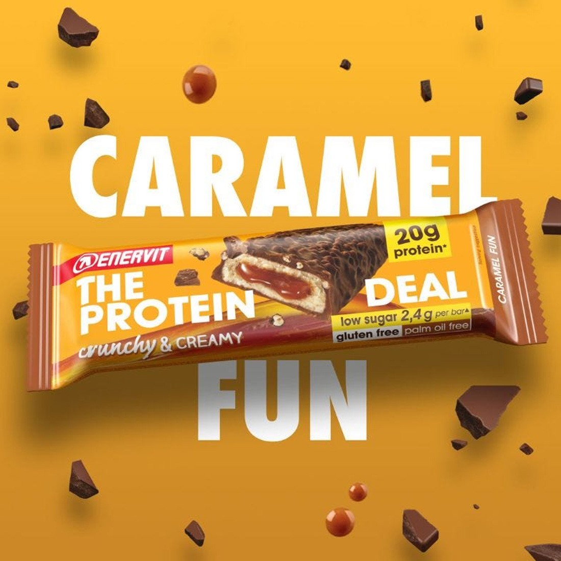 Protein Deal Caramel Fun es la barrita de proteína que te quita la culpa. Su fórmula baja en azúcar lo convierte en la alternativa ideal a los snacks convencionales, y sus 20g de proteína, un refuerzo proteico para tus días ajetreados.