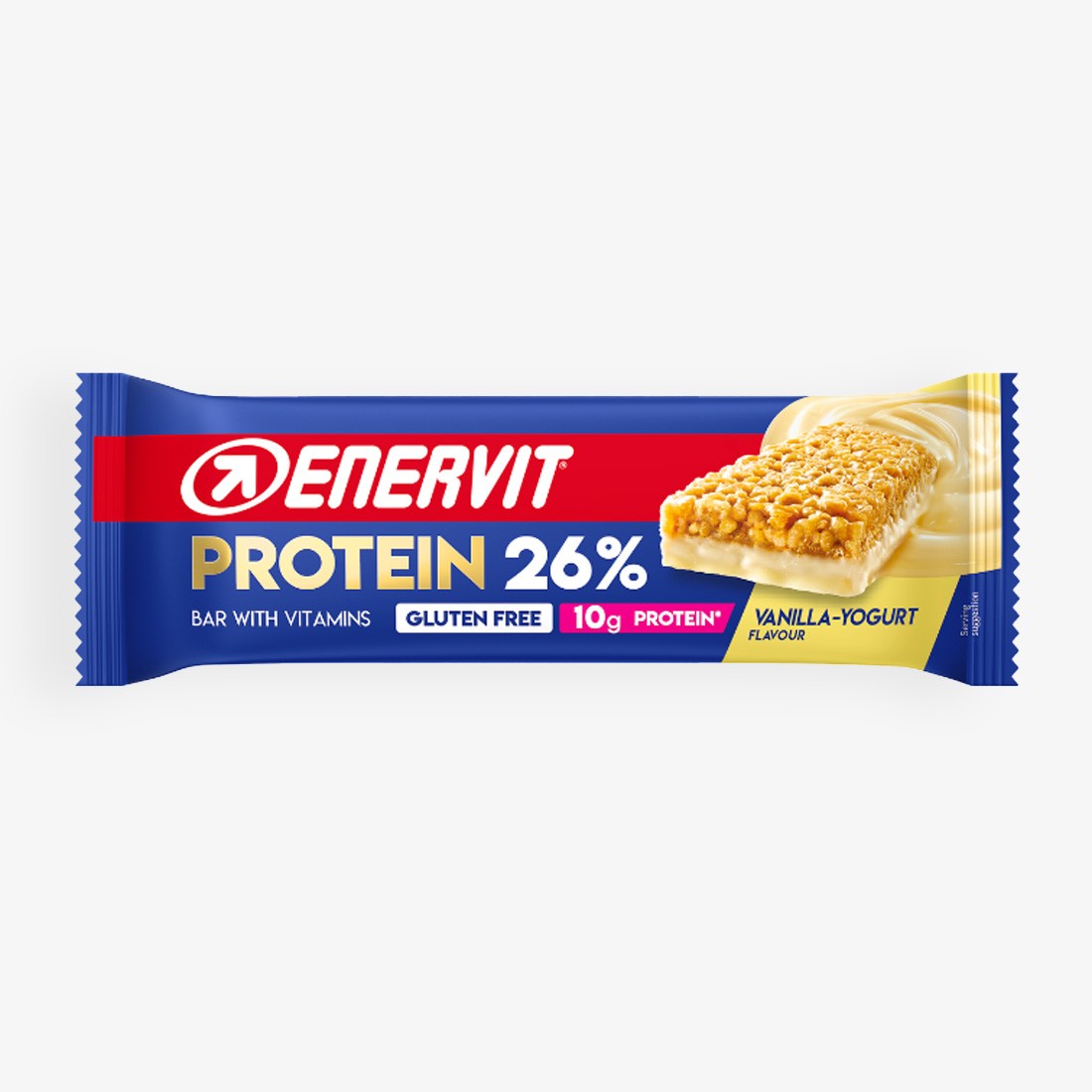 Enervit Protein Bar 26% Vaniglia-Yogurt es la barrita proteica que también te brinda un momento de puro placer, gracias a su dulce base de chocolate blanco y al fresco sabor del yogur.