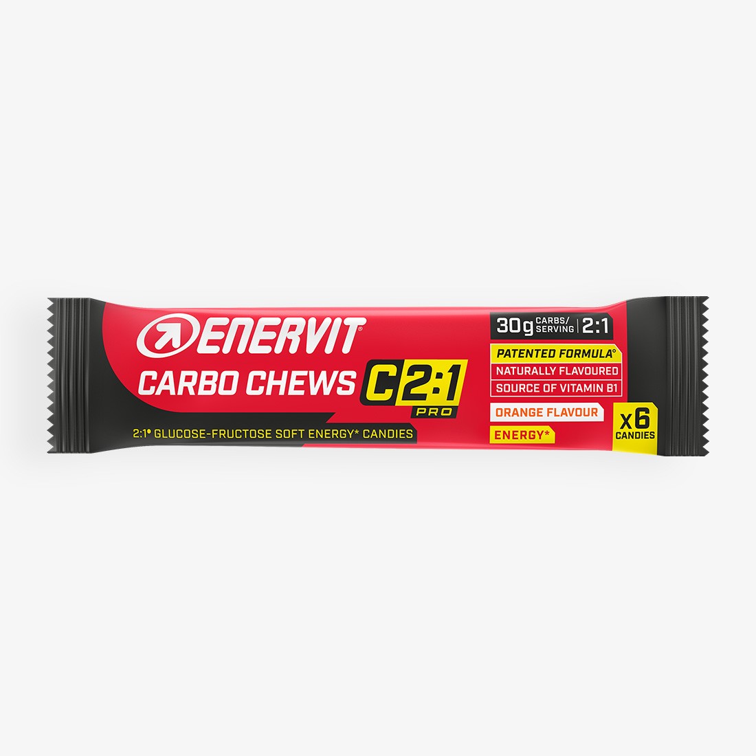 Máxima eficiencia durante el entrenamiento y la competición Céntrate en el esfuerzo, los kilómetros que te quedan por recorrer y en controlar la fatiga. Es algo que solo puedes conseguir cuando te acompaña un producto fácil y rápido de usar. Confía en Enervit Carbo Chews C2:1PRO para el entrenamiento y la competición. El práctico paquete de 6 caramelos de goma te permite repartir los 30 g de hidratos de carbono durante toda la actividad, cuando más lo necesites.